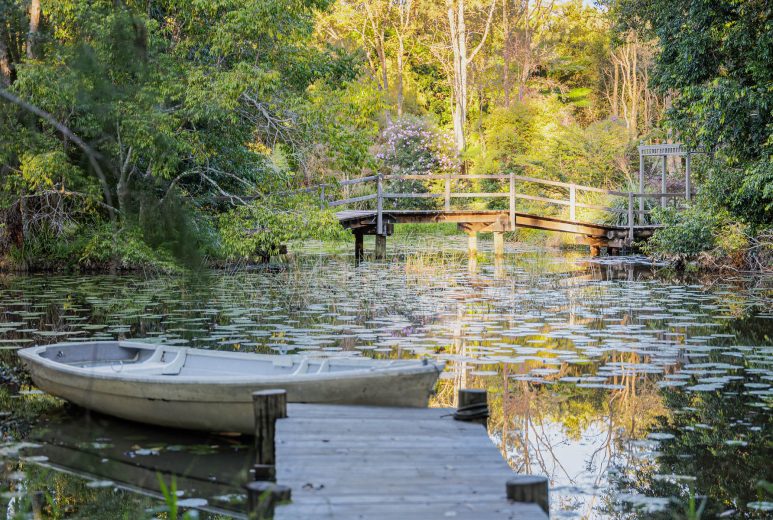 Located in the rolling green hills of Hydes Creek just 4 kms from Bellingen town, Lilypad Luxury Cabins is one of the best places to stay in Bellingen. Beautifully sited, the property overlooks waterlily filled ponds to the mountain views beyond. More than just accommodation and a place to stay, the unique property comprises 7.5 acres of spring fed waterways, bridges, gardens and bushland, creating a haven for native wildlife, and a wonderful location to stroll around or enjoy a romantic picnic lunch.